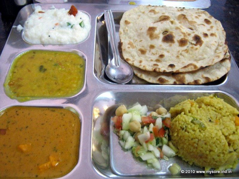 Items in Clockwise - Pulav (spiced rice), Salad, paneer (cottage cheese) masala curry, Dal (lentil) curry, curd rice and clay oven baked Indian Bread (Roti) .