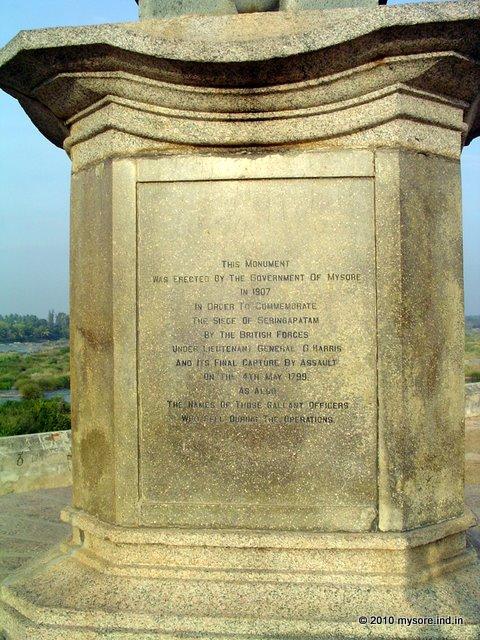 Above the base structure is a conical projection supported by four cannonballs. Another canon ball is fixed the the very top too.The inscription on one side reads " This monument is erected by the government of Mysore in 1907 in order to commemorate the siege of Seringapatam by the British forces under lieutenant general G. Harris and its final capture by assault on the 4th May 1799. As also the names of those gallant officers who fell during the operations."