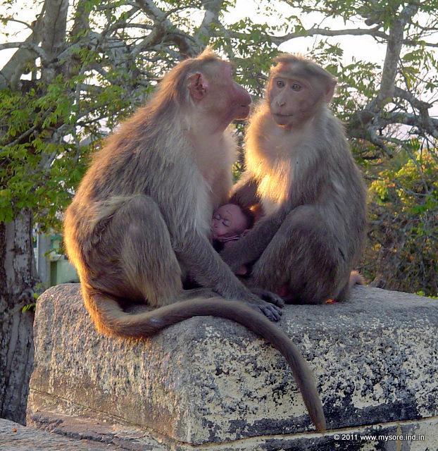 These are menace in many localities. This is not a peculiar problem for Mysore alone, you will find them in almost any town and cities of south India in general. Bonnet Macaque is a special case of wildlife overpopulation. The urban variety no more eat fruits, nuts or berries as their counterparts do in the wild. Rather they look for similar urban food. These monkeys do anything for food - snatch those popcorn bags from children, sneak into the kitchen, ripoff the overhead water tank lid to drink water to name a few. Challenge them, they will grimace with a hissing sound and show that intimidating canines. Bonnet Macaque are abounded around temples, parks and gardens and the likes were people bring food out in the open. You'll find them plenty atop the Chamundi hills. There is even an electric fence on the main tower of the Chamundeshwari Temple. It seems the macaques are not bothered. Their grin at you says so!